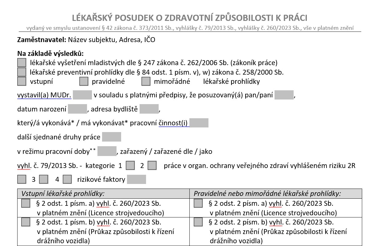 20.12.2023 Vzor formuláře lékařského posudku o zdravotní způsobilosti od 1. 1. 2024 V souvislosti s novou vyhláškou č. 260/2023 Sb., o stanovení podmínek zdravotní způsobilosti osob k provozování dráhy a drážní dopravy, která je účinná od 1. 1. 2024, uveřejňujeme doporučený vzor formuláře „Lékařský posudek o zdravotní způsobilosti“ pro dopravce a lékaře.