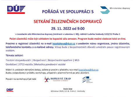 14.11.2022 Setkání železničních dopravců Drážní úřad pořádá setkání s železničními dopravci. Drážní úřad dne 29. 11. 2022 pořádá každoroční „Setkání železničních dopravců“. Setkání se koná v zasedacím sále …