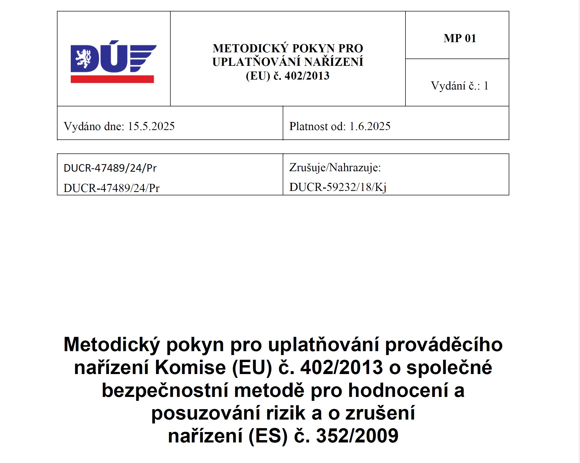 Vydali jsme nový Metodický pokyn pro uplatňování prováděcího nařízení Komise (EU) č. 402/2013 o společné bezpečnostní metodě pro hodnocení a posuzování rizik.